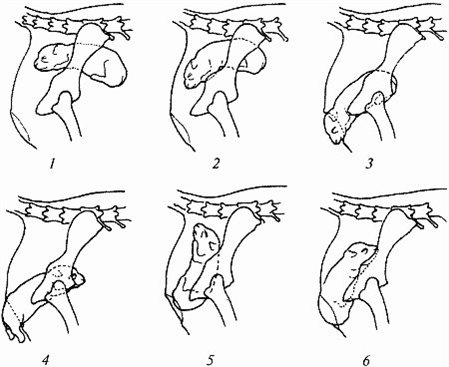 Рис. 13. Схема рождения щенков: 1–3 – нормальные роды; 4–6 – роды «задом наперед» (4 – с вытянутыми задними ногами, обычно проходят без осложнений; 5 – самое худшее положение, спинкой вниз; 6 – с подтянутыми задними ногами, рождается очень тяжело)