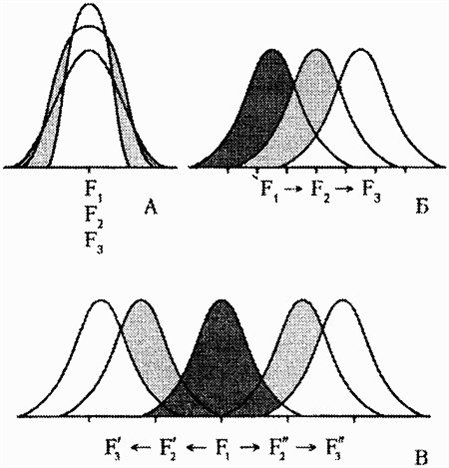 Рис. 24. Формы естественного отбора (по Тимофееву-Ресовскому и др., 1974): А – стабилизирующий отбор; Б – движущий отбор; В – дизруптивний (разрывающий) отбор F-поколения. На популяционных кривых заштрихованы отметаемые отбором варианты