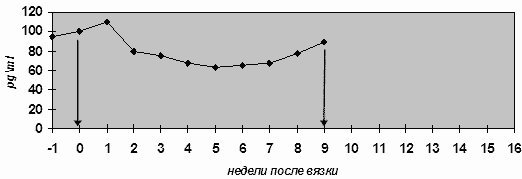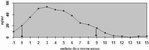 Рис. 11. Концентрация гонадотропина в крови беременной суки (по Железовой А.И., 1999)