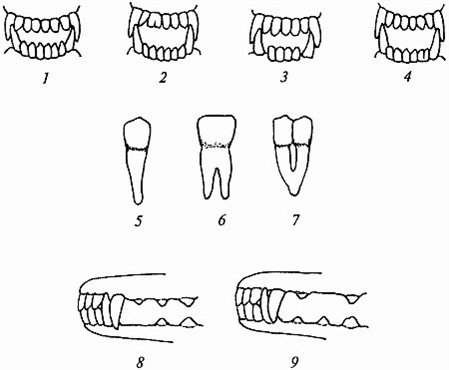 Рис. 21. Олигодонтия по резцам и премолярам: 1 – челюсти с нормальным количеством резцов; 2 – пять резцов в верхней челюсти, второй зуб слева сдвоенный, образован путем срастания коронок; 3 – челюсти с уменьшенным количеством резцов: пять резцов в верхней челюсти и четыре в нижней; 4 – пять резцов в нижней челюсти. Крайний правый зуб образован в результате срастания корней двух соседних; 5 – нормальный резец; 6 – сдвоенный резец, образованный срастанием коронок и частично корней; 7 – сдвоенный резец, образованный срастанием корней двух соседних зубов; 8 – олигодонтия по премолярам нижней челюсти. Отсутствует Р1; 9 – олигодонтия по премолярам верхней челюсти. Отсутствует Р2