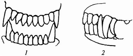 Рис. 22. Полиодонтия: 1 – по резцам; 2 – по клыкам, образованная невыпавшим молочным клыком