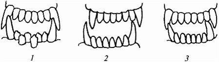 Рис. 23. Нерядность резцов и перекос челюстей: 1 – нерядность резцов нижней челюсти; 2, 3 – перекос челюстей