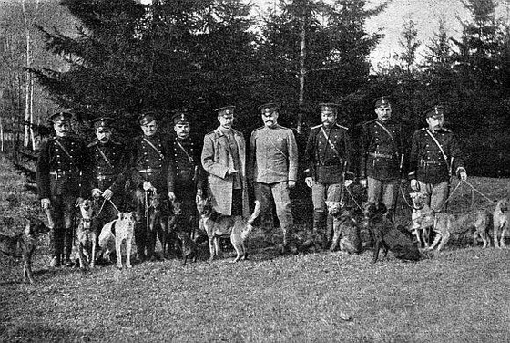 Тальсенский питомник. Полицейские собаки тальсенского уездного начальника барона А.Ф. Радена с проводниками.